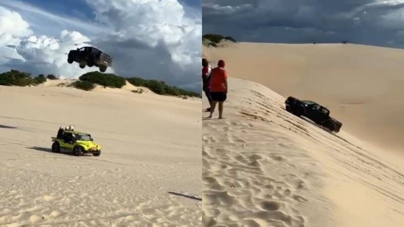 Picape voa em duna de Canoa Quebrada, quase provoca tragédia e fica destruída; vídeo chocante viraliza