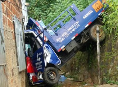 Caminhão fica pendurado em casa após motorista descer para retirar botijão em Itabuna