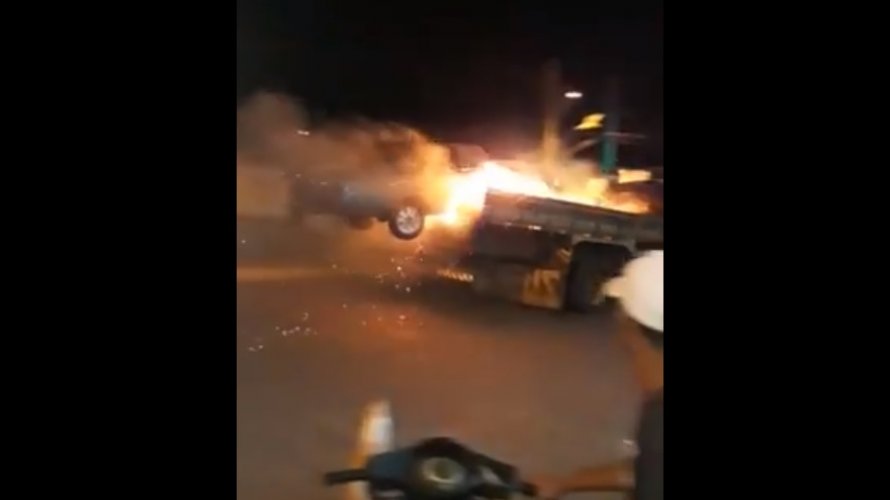 Caminhão transportando carro em chamas causa pânico em Itaberaba; assista