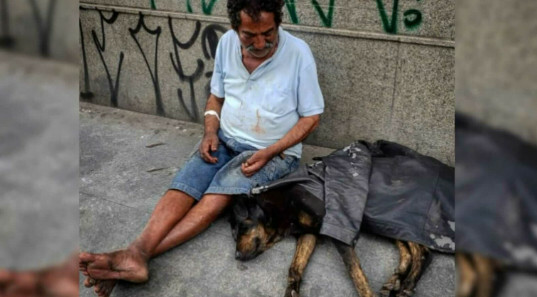 Homem em situação de rua cede jaqueta para esquentar cachorro em dia frio