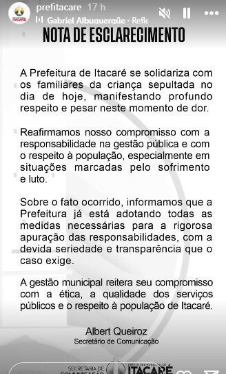 “Sobre o fato ocorrido, informamos que a Prefeitura já está adotando todas as medidas necessárias para a rigorosa apuração das responsabilidades, com a devida seriedade e transparência que o caso exige”, diz a gestão em trecho da nota.