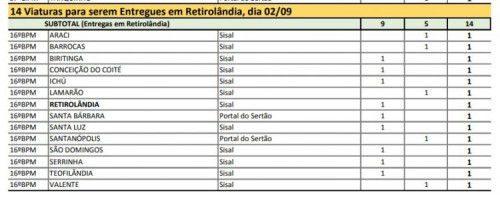 As únicas cidades do território do sisal que não constam na lista de entrega de viatura são Queimadas, Cansanção e Itiúba municípios que pertencem ao Batalhão de Senhor do Bonfim vinculado ao Comando Policiamento Regional Norte (CPRN) com sede em Juazeiro.