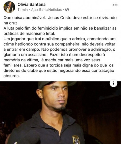 A deputada estadual Olívia Santana, que é militante do movimento de mulheres negras, também usou as redes sociais para manifestar repúdio a possível contratação do ex-goleiro do Flamengo pelo Fluminense de Feira de Santana.