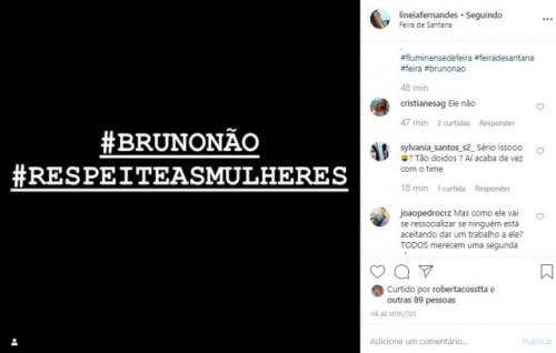 “Como representante da torcida e principalmente das mulheres no meio futebolístico, sou contra a vinda do goleiro Bruno para o Fluminense de Feira. Não sou Deus para julgar ninguém, mas acredito que seria uma mídia negativa para o clube. Não estamos precisando de goleiro e ele sempre será lembrado por ter ceifado a vida de uma jovem por causa de uma pensão. Concordo que devemos ressocializar as pessoas, mas não será representando meu time que eu vejo isso. Acho que ele deveria fazer trabalhos comunitários e não voltar ao futebol como se nada tivesse acontecido, depois de ter tirado a vida de alguém. Ele não representa meu clube, não me representa”, afirmou.