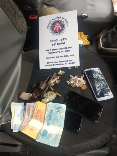 Um revólver calibre 32, 26 pedras de crack, nove sacos com maconha, três tubos de cocaína, três celulares e R$ 758 foram apreendidos, na noite desta quinta-feira (12), com um traficante de drogas, já com passagem na polícia por tráfico de drogas, e um adolescente, na localidade do Corre ou Morre, Jardim Lobato.