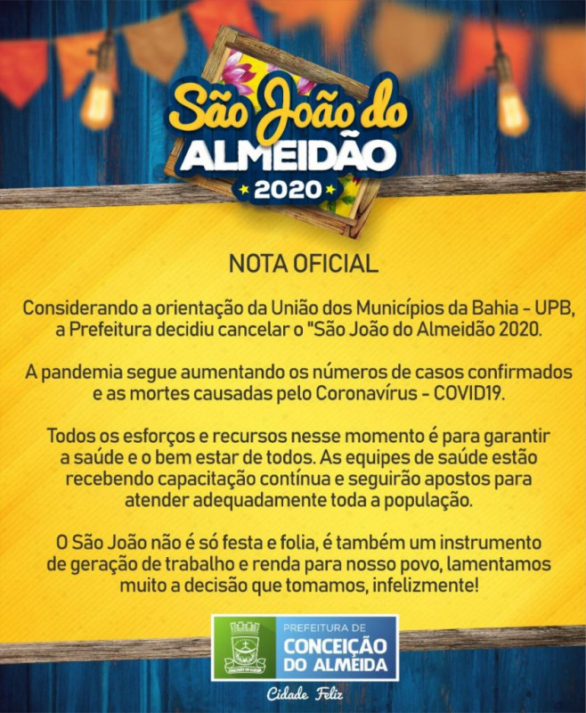 Em comunicado, a gestão municipal informou que seguiu orientação da União dos Municípios da Bahia (UPB). “O São João não é só festa e folia, é também geração de trabalho e renda para o nosso povo, lamentamos muito a decisão que tomamos, infelizmente”, diz um trecho da nota.