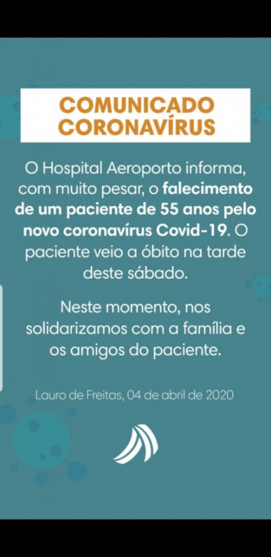Chega a oito o número de mortos pelo novo coronavírus na Bahia. Segundo informações divulgadas pelo Hospital Aeroporto, neste sábado (4), um paciente de 55 anos não resistiu às complicações da doença e faleceu no período da tarde.