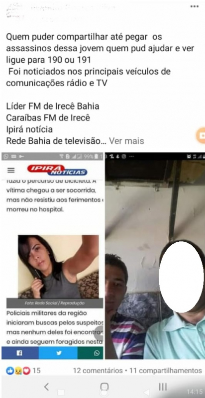 Está circulando uma montagem de dois rapazes como sendo suspeitos do assinato da jovem Denise Costa Ferreira, no dia 05 do mês corrente na cidade de Lapao-Ba. O rapaz de blusa listrada nada tem a ver com o crime, ele nunca saiu da cidade de Luis Eduardo Magalhães-BA, essa foto ele tirou há anos atrás com esse rapaz que era vizinho dele , alguém muito mal intencionado pegou a foto no Facebook e colocou ao lado da matéria que o blog Ipirá notícias compartilhou. Já fizemos um boletim de ocorrência e incluímos o nome do autor da publicação. Nós da família do rapaz de blusa listrada sentimos muito pelo ocorrido com essa jovem moça, mas queremos aqui lutar por justiça também pela vida desse outro jovem que está sendo acusado de um crime que ele não cometeu. Uma notícia falsa pode acabar com a vida de outras pessoas. É importante verificar a veracidade das informações antes de compartilhar. É crime… Em momento algum a polícia divulgou essa foto como acusados. Já fomos a delegacia, estamos a disposição. Nossa família também está com medo de perder seu ente querido por causa de uma publicação com um jovem inocente. Pedimos de coração que não compartilhe algo sem saber a veracidade, pode custar vidas.