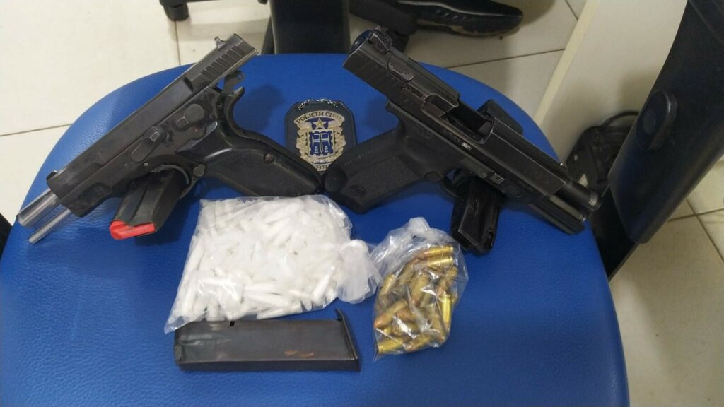 De acordo com informações da Secretária de Segurança Pública (SSP-BA), o flagrante aconteceu no bairro Brasília de Valéria, após denúncia anônima. Com ele, foram apreendidos duas pistolas, calibre 9 milímetros, e 162 pinos de cocaína.