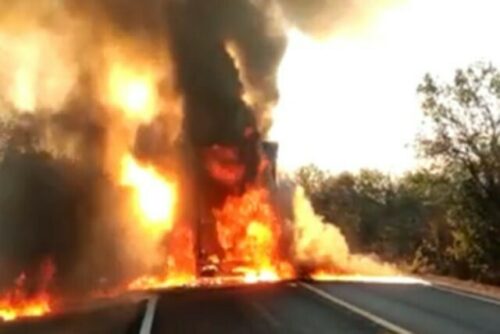 A motocicleta que a vítima conduzia colidiu com caminhão carregado com bebida. Os dois veículos pegaram fogo após o acidente.