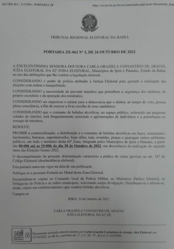 O comércio, distribuição e consumo de bebida alcoólica estão proibidos, a partir das 0h deste domingo (30) até às 19h do mesmo dia, em Ipirá e Pintadas. A chamada “Lei Seca” ocorre em razão da realização do segundo turno das eleições.