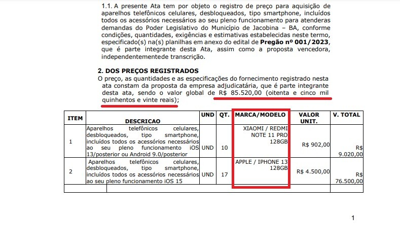 A Câmara de Vereadores de Jacobina divulgou, no Diário Oficial do Poder Legislativo desta terça-feira (29), a compra de dezessete iPhones 13, um dos modelos mais recentes da Apple. Cada aparelho custa em torno R$ 4,5 mil, totalizando R$ 76 mil.