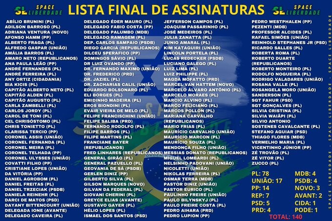 Entre os 140 nomes, a maioria é do Partido Liberal (78), em seguida está o União Brasil, sigla que tem três ministérios no governo Lula, mas que mesmo assim 17 parlamentares demonstram apoio à saída de Lula da Presidência.