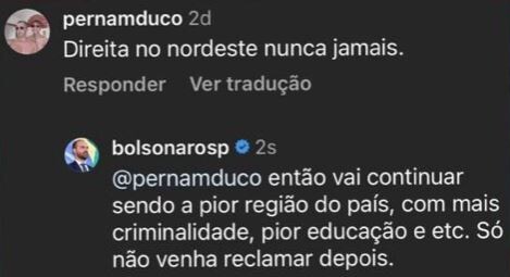 O deputado federal Eduardo Bolsonaro (PL-SP), filho 02 do ex-presidente Jair Bolsonaro, disse em uma rede social, nesta quinta-feira (30), que o Nordeste é a “pior região do país”. A afirmação foi feita em resposta a um comentário feito em seu perfil no Instagram que dizia “Direita no Nordeste nunca mais”.