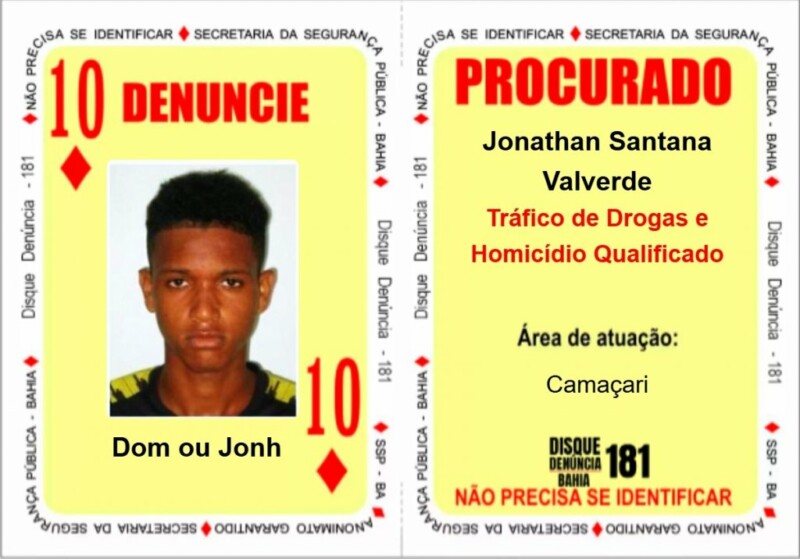 A carta Dez de Ouros estampa a figura de Jonathan Santana Valverde, conhecido como “Dom” ou “Jonh”. Ele possui quatro mandados por homicídio qualificado e tráfico de drogas.