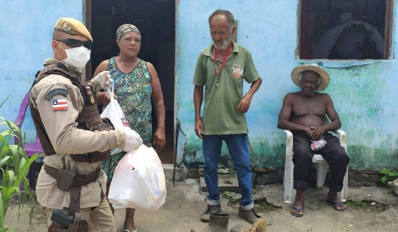 PMs fazem doações de produtos de limpeza e alimentos para famílias no interior da Bahia