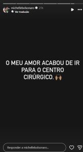Michelle, no entanto, disparou mensagens pelos stories do Instagram na manhã desta quinta-feira (25), quando Bolsonaro foi levado para o centro cirúrgico.