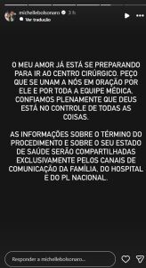 Por volta das 9h30, Michelle voltou à rede para informar que “o meu amor acabou de ir para o centro cirúrgico”.
