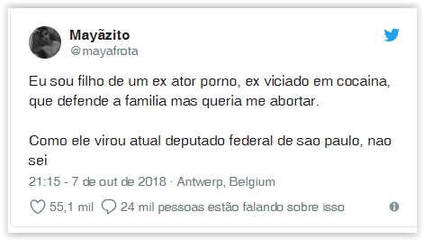 O ex-ator pornô Alexandre Frota (PSL-SP) foi eleito deputado federal por São Paulo com 155.522 votos, entrado assim para a lista dos 20 mais votados do Estado. No Twitter, o filho do político, Maya Frota, ficou surpreso com o resultado das urnas. “Eu sou filho de um ex-ator pornô, ex-viciado em cocaína, que defende a família, mas queria me abortar.