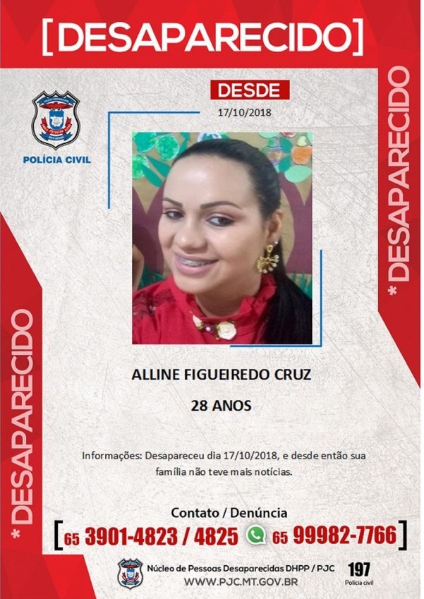 Familiares de Alline denunciaram o desaparecimento na quinta-feira (18) relatando que a última vez que havia sido vista foi na noite de quarta-feira. Naquela ocasião, ela afirmou ao marido que iria para um shopping em Várzea Grande para participar de um curso na área de estética e beleza.