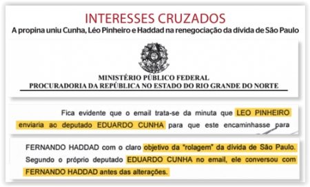 As informações que ligam Haddad, Pinheiro e Cunha constam do inquérito da Operação Manus, que investigou superfaturamento na construção do estádio Arena das Dunas, em Natal (RN), caso que levou à prisão o ex-deputado Henrique Eduardo Alves (RN). Além do caso específico do estádio potiguar, o inquérito concentrou outros indícios da relação de Cunha com a OAS. As peças juntadas no inquérito ligam os interesses dos três envolvidos na triangulação. Em 2012, durante a campanha eleitoral, Haddad recebeu doações da ordem de R$ 850 mil da empresa de Léo Pinheiro. À época, a OAS mantinha seis contratos com a prefeitura paulistana, e as dificuldades de recursos da administração municipal, na avaliação do MP, certamente refletiriam na possibilidade de tais contratos serem honrados. Somados, os contratos tinham valor global de R$ 1,4 bilhão. No relatório da Operação Manus, o MPF é explícito: Cunha “atuou em favor dos interesses da OAS relacionados à rolagem da dívida pública do Município de São Paulo, na gestão do prefeito Haddad”. Pela denúncia, Cunha trocou mensagens entre junho e outubro de 2013 com “Léo Pinheiro” justamente falando sobre essa matéria.