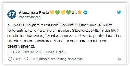 “1 Enviar Lula para o Presidio Comum. 2 Criar uma lei muito forte anti terrorismo e incluir Boulos, Stedile,Cut,Mtst,3 destituir os direitos humanos,4 acabar com as verbas de publicidade dos pilantras da comunicação 5 acabar com a campanha do desarmamento”, escreveu Alexandre Frota na rede social.