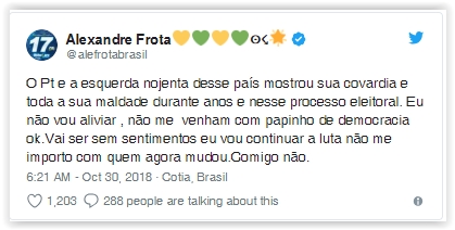 Além disso, em outro tuíte, o ex-astro do cinema pornô prometeu “não aliviar” contra o PT e a esquerda brasileira, ressaltando que não quer “papinho de democracia”.