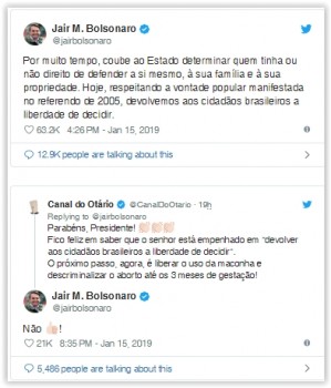 “Parabéns, Presidente! Fico feliz em saber que o senhor está empenhado em “devolver aos cidadãos brasileiros a liberdade de decidir”. O próximo passo, agora, é liberar o uso da maconha e descriminalizar o aborto até os 3 meses de gestação!”, escreveu o seguidor, que foi surpreendido por uma resposta de Bolsonaro.