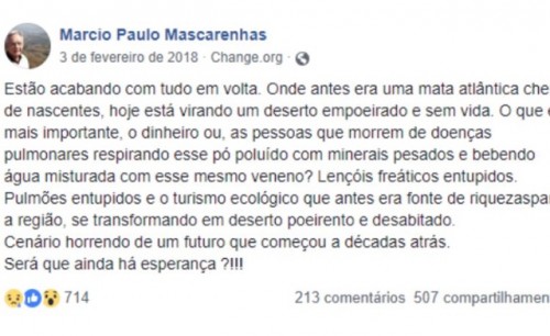 “Onde antes era uma mata atlântica cheia de nascentes, hoje está virando um deserto empoeirado e sem vida. O que é mais importante, o dinheiro ou, as pessoas que morrem de doenças pulmonares respirando esse pó poluído com minerais pesados e bebendo água misturada com esse mesmo veneno?”, escreveu. “Cenário horrendo de um futuro que começou décadas atrás. Será que ainda há esperança?”