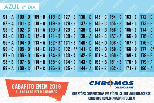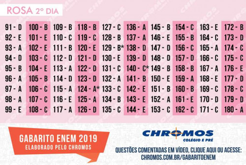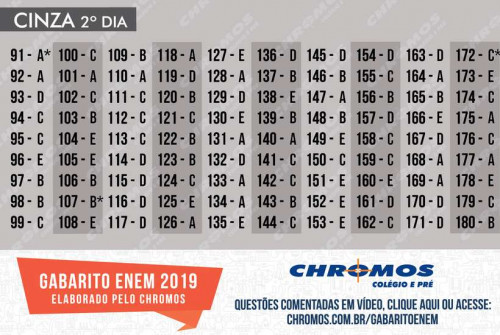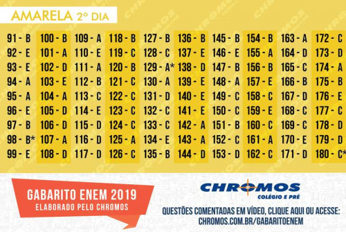 Em parceria com o Portal Uai, o Chromos faz a correção e a divulgação antecipada do gabarito extraoficial do Enem 2019. Neste segundo dia de prova, a equipe de professores da instituição, além de fechar e lançar as respostas, gravará vídeos, em tempo real, resolvendo e comentando todas as questões.