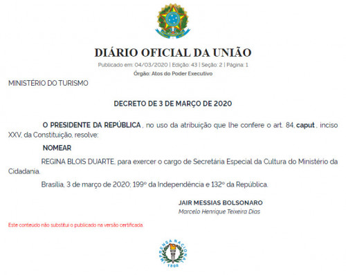 Mais de um mês após a atriz aceitar o convite do presidente Jair Bolsonaro para assumir a Secretaria Especial da Cultura, Regina Duarte teve sua nomeação publicada, nesta quarta-feira (4), no Diário Oficial da União. A cerimônia de posse acontece às 11h, no Palácio do Planalto, em Brasília.