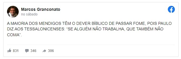 O pastor Marcos Granconato escreveu em uma publicação no Facebook no domingo (1º) que “mendigos têm o dever bíblico de passar fome”. Para justificar a fala, o religioso citou o versículo 10, do capítulo 3, do livro 2 Tessalonicenses.