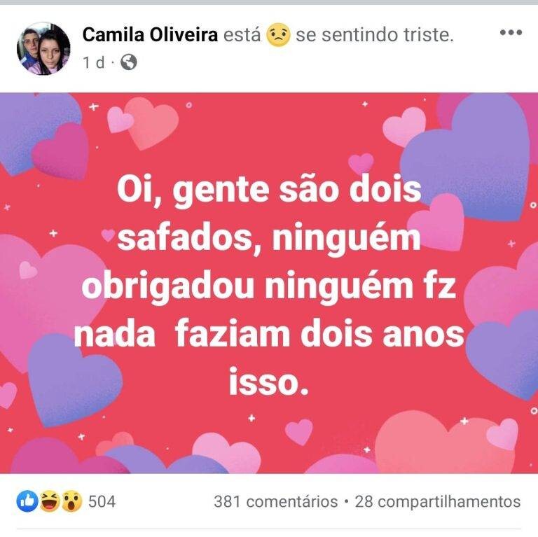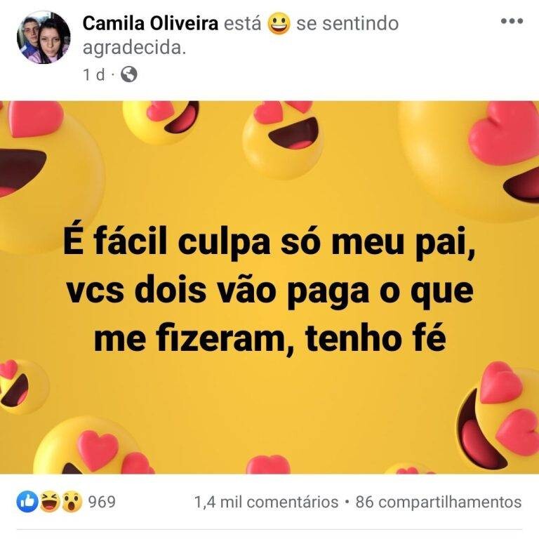 Camila também afirmou que o pai não é o único responsável pela situação: “É fácil culpar só meu pai, vocês dois vão pagar pelo que me fizeram, tenho fé”. Por fim, ela chegou a imprimir conversas entre o pai e o marido no WhatsApp e a espalhar as capturas de tela pela cidade.