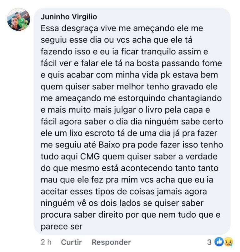 O marido da mulher, porém, usou as redes sociais para se defender e dizer que estava sendo ameaçado pelo sogro. “Quem quiser saber melhor, tenho gravado ele me ameaçando, me extorquindo, chantageando”, escreveu. O sogro negou as acusações e postou que o jovem não foi obrigado a fazer nada. “Tudo o que o meu ex está postando é mentira, agora quer ser santo”, disse ele.