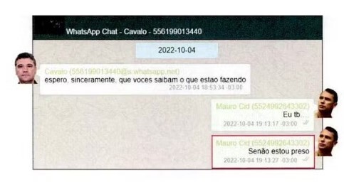 No diálogo de 4 de outubro de 2022, o coronel Sérgio Ricardo Cavaliere de Medeiros escreveu esperar que “vocês”, em referência ao núcleo próximo a Jair Bolsonaro, “saibam o que estão fazendo”.