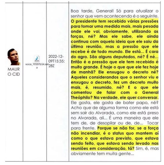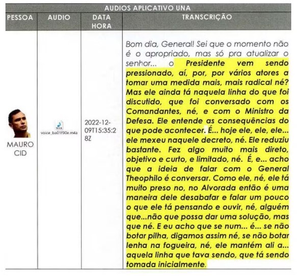 O histórico de mensagens de Mauro Cid obtido pela PF destaca, ainda, um áudio enviado pelo então ajudante de ordens de Bolsonaro ao então comandante do Exército, general Freire Gomes.