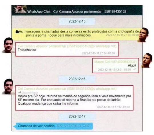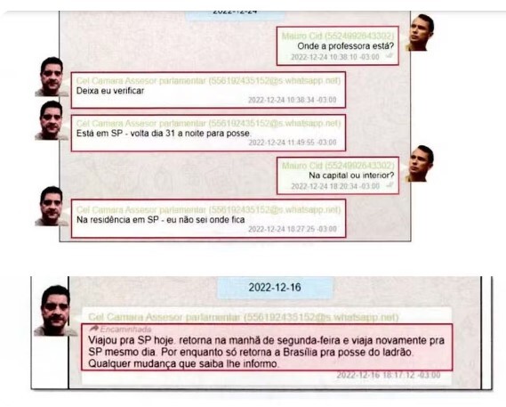 As mensagens apontam que, entre 15 e 22 de dezembro de 2022, Cid questionou Câmara sobre o paradeiro de Moraes, segundo a Polícia Federal. Veja abaixo: