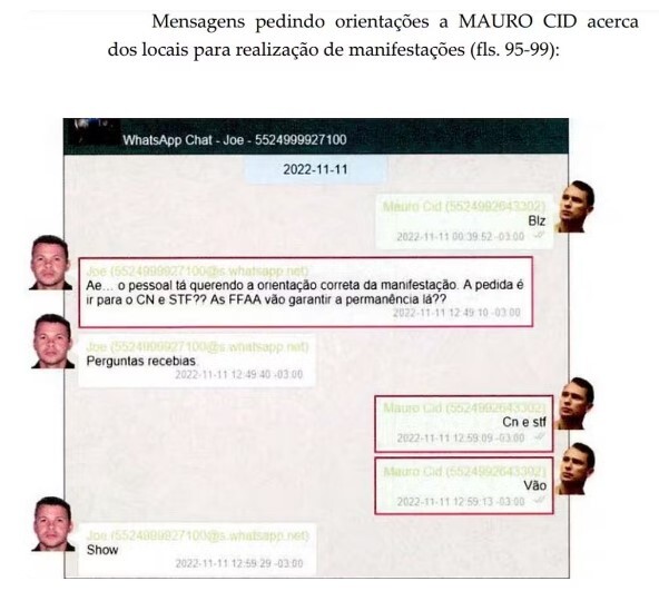 Um dos diálogos anexados pela PF é entre Cid e o major das Forças Especiais do Exército Rafael Martins, em novembro de 2022, já depois das eleições. Segundo a corporação, nas conversas, Cid orientou o militar sobre manifestações em Brasília.