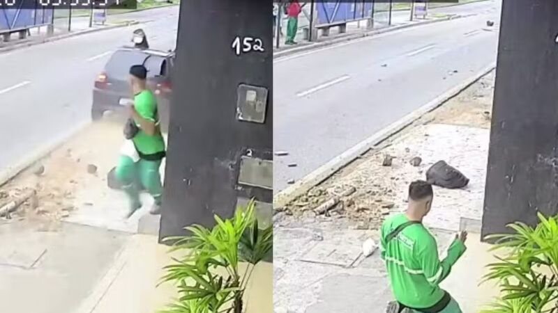 Agente de limpeza escapa por pouco de atropelamento e agradece de joelhos: ‘Livramento’; assista