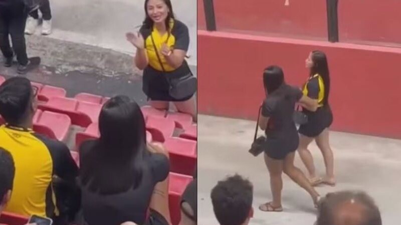 Torcedora flagra namorado com outra e deixa estádio de mãos dadas com a amante