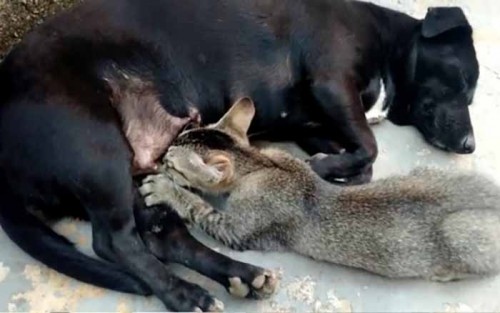 Cadela surpreende donos ao ‘adotar’ e amamentar filhote de gato