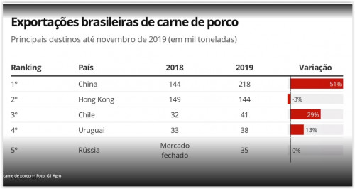 Para a carne suína, os chineses aumentaram em 51% as compras entre janeiro e novembro deste ano.