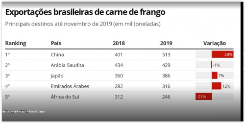 Na carne de frango, os chineses compraram 28% a mais que o registrado até novembro de 2018, ultrapassando a Arábia Saudita, que liderava esse ranking há mais de uma década.