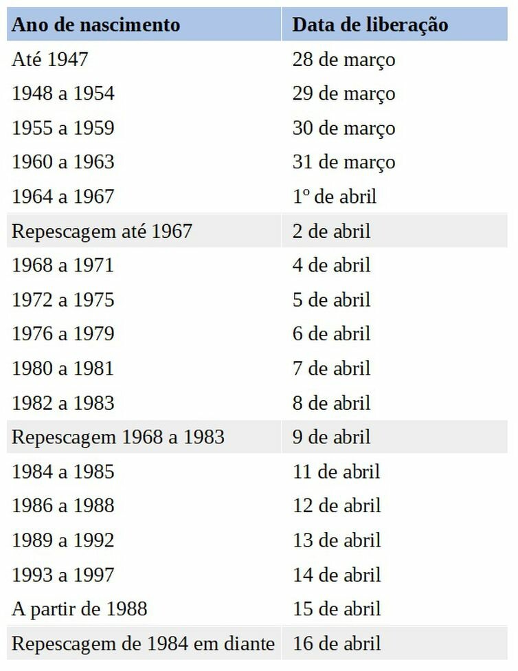 Nas últimas três semanas, os correntistas puderam agendar a retirada, segundo cronograma escalonado pelo ano de nascimento ou de fundação da empresa. Nascidos antes de 1968 puderam pedir o agendamento entre os dias 7 e 12. Para nascidos entre 1968 e 1983, o processo ocorreu dos dias 14 a 19. Na semana passada, foi a vez dos nascidos a partir de 1984, entre os dias 21 a 26. As mesmas datas valem para a criação das empresas.