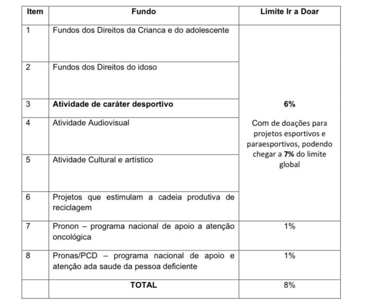 6- Aumento de 1 ponto percentual na dedução de doações para projetos esportivos e paraesportivos, podendo chegar a 7% do Imposto de Renda devido;