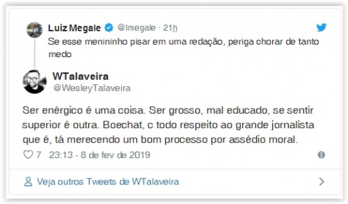 Boechat, que não usa redes sociais, disse não se importar com o “bafafá” sobre o ocorrido. Quando informado que internautas o acusaram de assédio moral, o apresentador comentou em tom irônico: “Ah mas eu tô abaladíssimo com isso! Recomendo a essas pessoas que não me peçam emprego! Se as pessoas acham que não é normal, paciência. Elas que construam as suas próprias avaliações”.