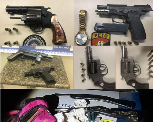 Já no domingo (17), aconteceram três ações policiais com armas de fogo localizadas. Uma foi realizada pela 66ª Companhia Independente da Polícia Militar (CIPM/Feira de Santana), no bairro Parque Ipê. Uma pistola 9 mm e dez munições foram apreendidas. A segunda deste dia, também em Feira, aconteceu no bairro George Américo, onde dois revólveres calibre .38 foram retirados das ruas pela Base Comunitária de Segurança (BCS) local.