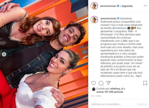 “Será mais um novo desafio, mais uma experiência pro meu diário de apresentadora e o meu coração transborda gratidão a Deus por poder expandir meu conhecimento na área televisiva, por poder estar ‘Ao Vivian’ do jeitinho que eu gosto, e por ser ao lado da Titi e do Bruno, que me receberam super bem. Ninguém segura esse trio, Brasil!”, completou.
