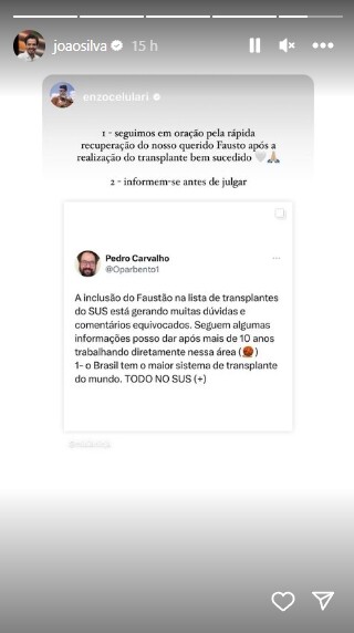 João Guilherme Silva, filho do apresentador Fausto Silva, reagiu às críticas sobre a rapidez com que foi feito o transplante de coração ao qual seu pai foi submetido neste domingo (27). Em seu perfil no Instagram, ele compartilhou uma publicação que rebate mensagens de que Faustão teria furado a fila de transplante de órgãos.