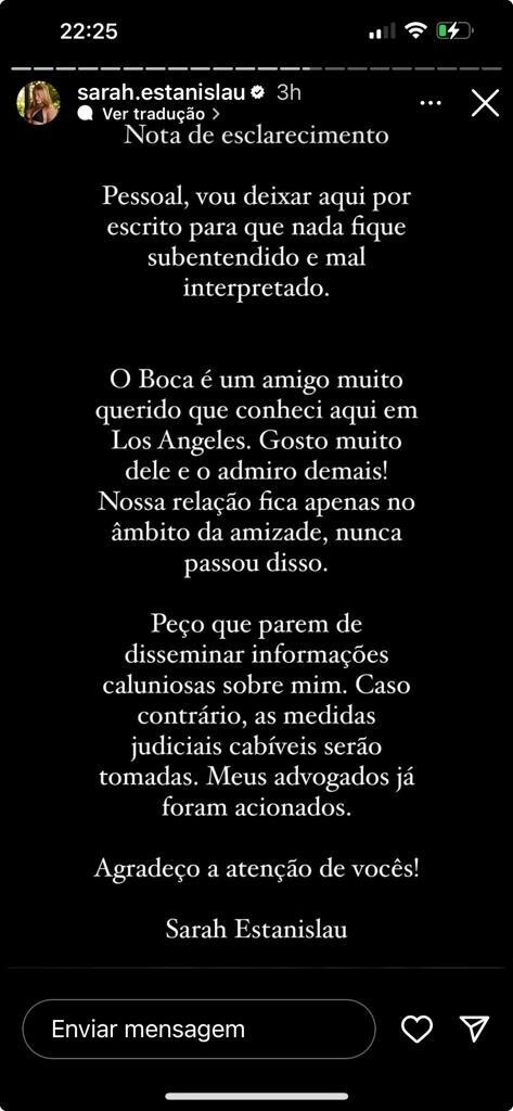 “Pessoal, vou deixar aqui por escrito para que nada fique subentendido e mal interpretado. O Boca é um amigo muito querido que conheci aqui em Los Angeles. Gosto muito dele e o admiro demais! Nossa relação fica apenas no âmbito da amizade, nunca passou disso. Peço que parem de disseminar informações caluniosas sobre mim. Caso contrário, as medidas judiciais cabíveis serão tomadas. Meus advogados já foram acionados”.